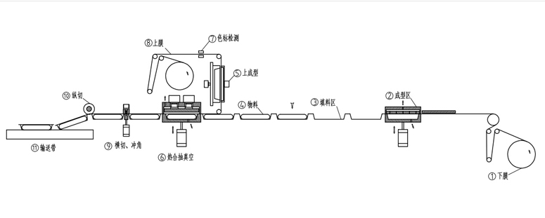 2、設備前端(上)(成型區域) 由成型模具和上加熱模具組成,使下膜成型成所設定形狀。 |