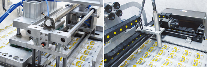 4、設備中部(封口和真空區域) 由封口模具和上加熱模具,設備通過步進到達封口真空區域,下膜模具通過氣缸上升、壓緊上加熱模具,再通過真空管路進行抽真空,最后完成封口。 |