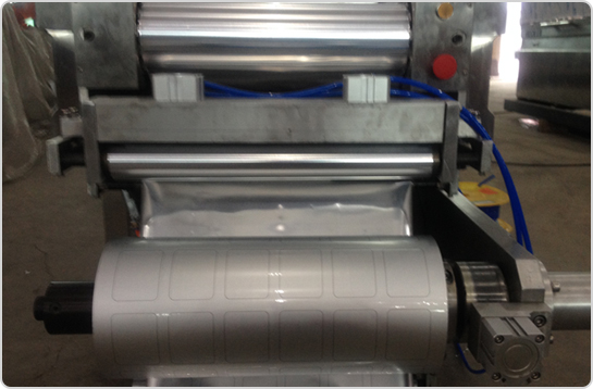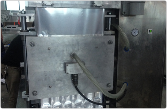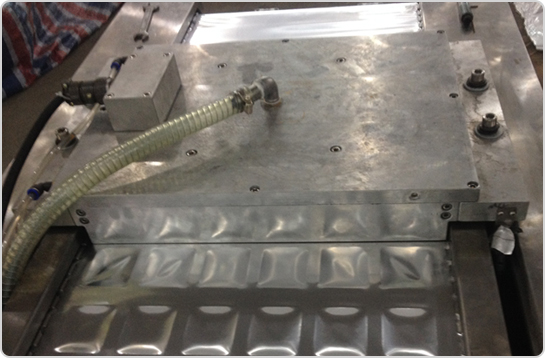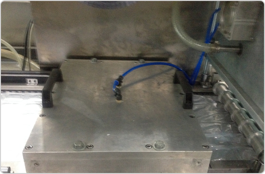 4、設備中部(封口和真空區域) 由封口模具和上加熱模具,設備通過步進到達封口真空區域,下膜模具通過氣缸上升、壓緊上加熱模具,再通過真空管路進行抽真空,最后完成封口。 |