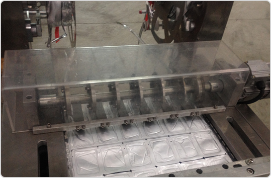 3、設備中部(上膜熱成型區) 只需要將物料擺放好到成型好的格子當中即可,剩下的事情都交給機器了。 |