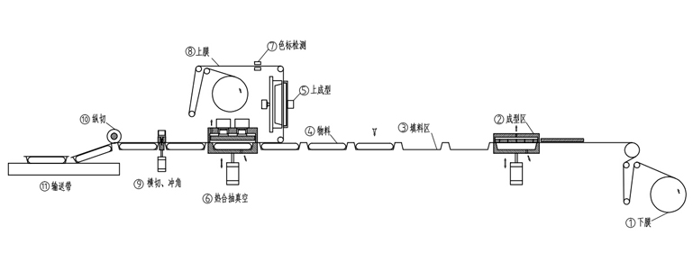 2、設備前端(上)(成型區域) 由成型模具和上加熱模具組成,使下膜成型成所設定形狀。 |